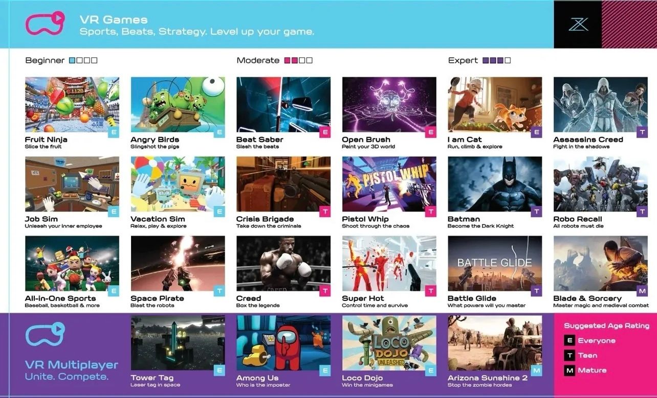 VR Interactive GamesOur Interactive Stations are packed with the most diverse selection of VR games in the lounge. There's truly something for everyone! Start with beginner-friendly favorites like Fruit Ninja and Angry Birds, dive into popular hits like Beat Saber, Super Hot, and Job Simulator, or get creative with painting, sports and music-based experiences that help build skills and coordination. For advanced players, we’ve got action-packed titles like Assassin’s Creed, Blade & Sorcery, Battle Glide, and more.