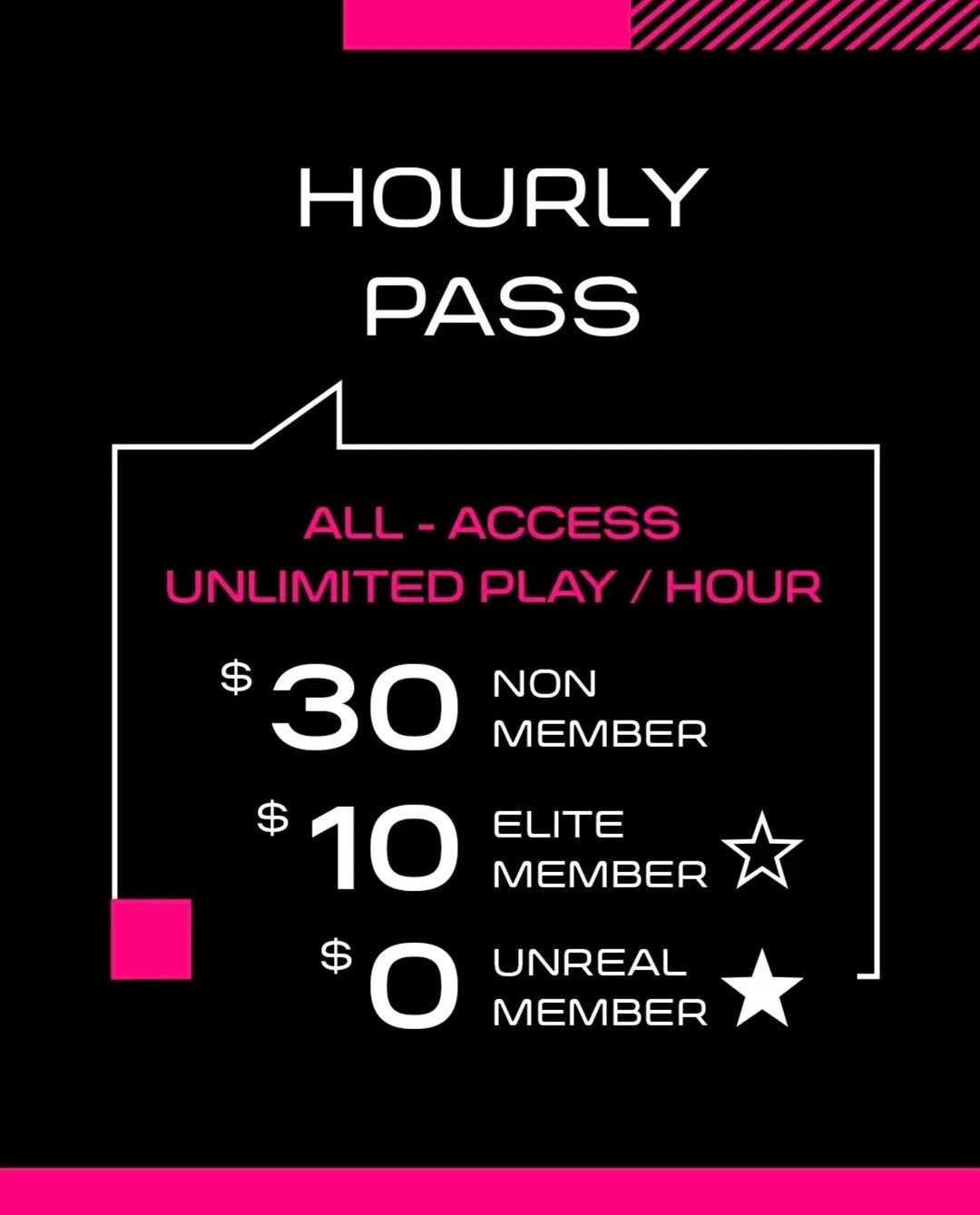 ![]() Hourly PassThe All-Access Hourly Wristband covers all the games in the lounge. You can move around and try anything you want! Our Game Masters will assist you, teach you and answer any questions during your play time. $30/hr non-member $10/hr Elite Member Unreal Member UNLIMITED PLAY | ![]() Membership TiersPlanning to come more often? Become a member and save! Our memberships give you major discounts on Hourly Passes, Party Packages, and more to come. Perfect for frequent players and families who want the best value! $40/30-days Elite Member $100/30-days Unreal Member Membership auto-renewal is optional at time of sign-up. No fees/restrictions for cancelling. Members receive one FREE hour of play on day of sign-up! |
